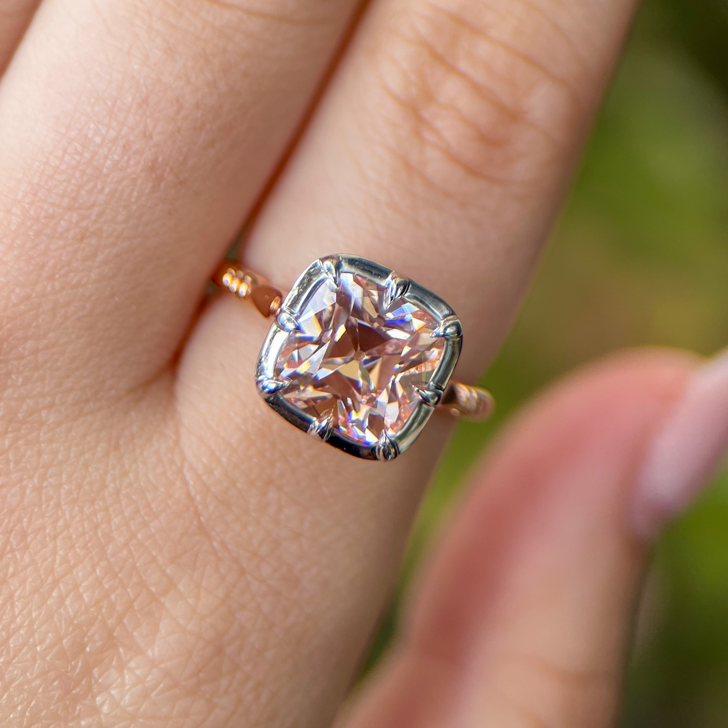 To stay true to the Georgian era aesthetic of the design, we recommend antique cut diamonds and colored stones in cushion or round shapes. However, it can be adapted to fit other shapes if your heart is set on something else. Due to the button back design, we do not recommend any elongated shapes such as emerald cuts.