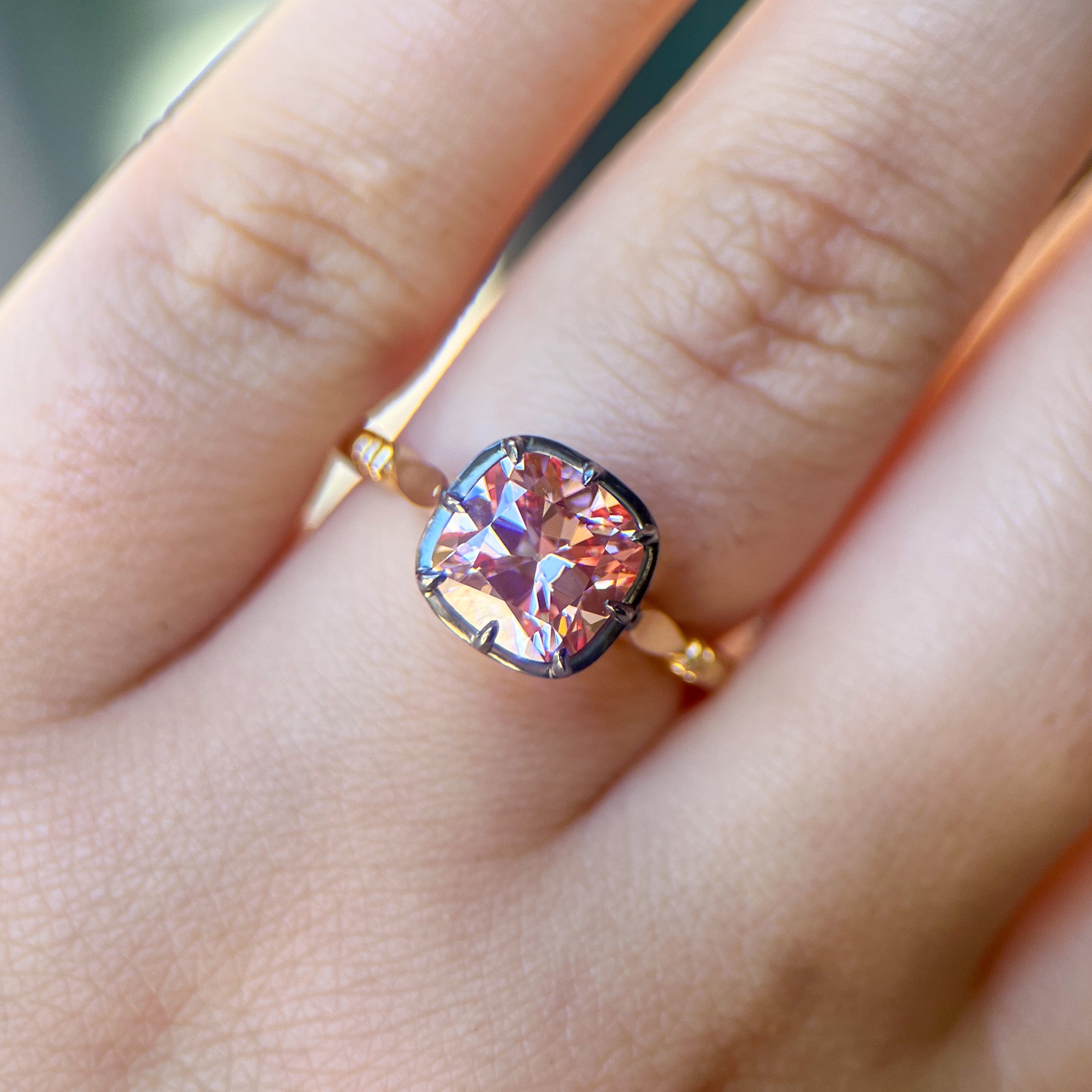 A timeless Georgian-inspired collet setting in 18K yellow gold and black rhodium-plated platinum. This setting can accommodate most shapes and is excellent for more fragile stones such as emerald.